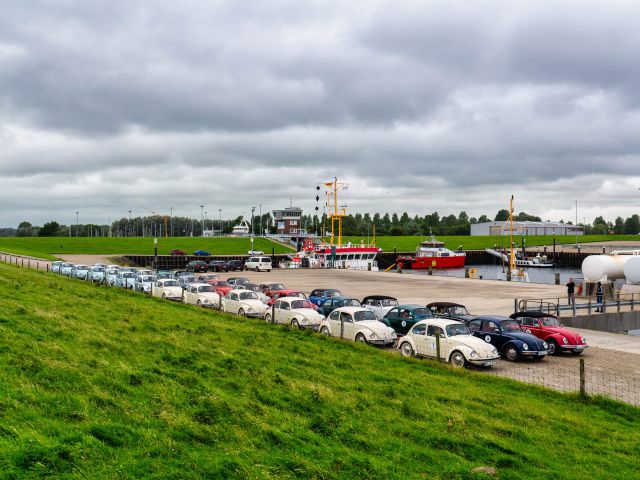 We continued our journey to Sielhof Neuharlingersiel, where a unique atmosphere awaited us. All the car parks there were blocked off for the Beetles. We were served tea and a freshly baked Frisian waffle with cherries and cream. All the Beetles remained parked at the Sielhof, while the group of Beetles set off on foot to the ferry quay for the departure of the ferry to the island of Spiekeroog.