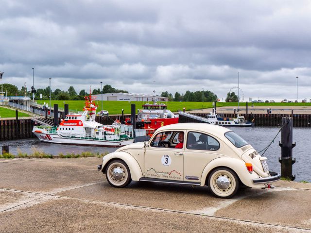 The Beetle convoy drove to a pier in Hooksiel, where all the Beetles lined up on the North Sea shore. The Beetles lined up on the North Sea shore for a photo session. The K-UE Beetle Club has never been so close to the Beetles on the North Sea. The Bernhard Gruben lifeboat is also moored here, and we didn't miss the opportunity to take photos of all the participants with their Beetles and the lifeboat.