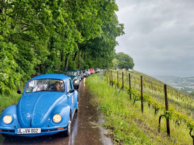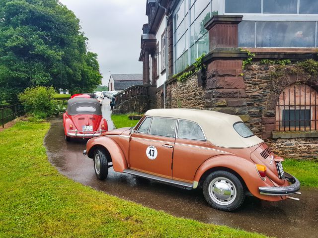 The reception at the Vulcano-Lindenhof Hotel was accompanied by Mexican dancing in traditional costumes. Due to heavy rain and flooding, the 17 May 2024 had to be reorganised on site. The boat trip and treetop walk were cancelled, but the Beetles still managed to travel through the Ayler Krupp vineyards with the fire brigade and then enjoy a coffee at the Ayler Hütte. The Ayler Verein's music band played there in good spirits despite the constant rain. The Beetles then drove to the Saarstein Castle winery for wine tasting and dinner.