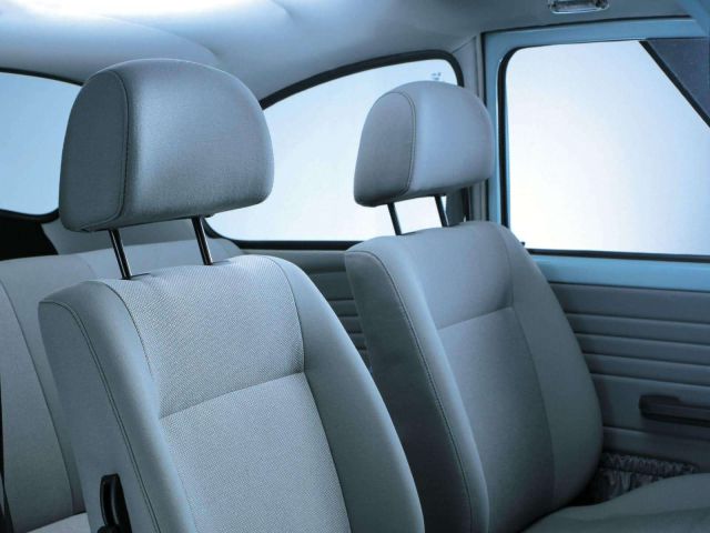 Sitzstoffbezüge im Design "Panama MINI" mit Ablagetaschen an den Rückseiten der Vordersitze flanellgrau bei Wagenfarbe "Aquariusblue" und schwarz bei Wagenfarbe "Harvestmoonbeige"