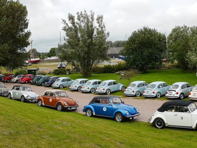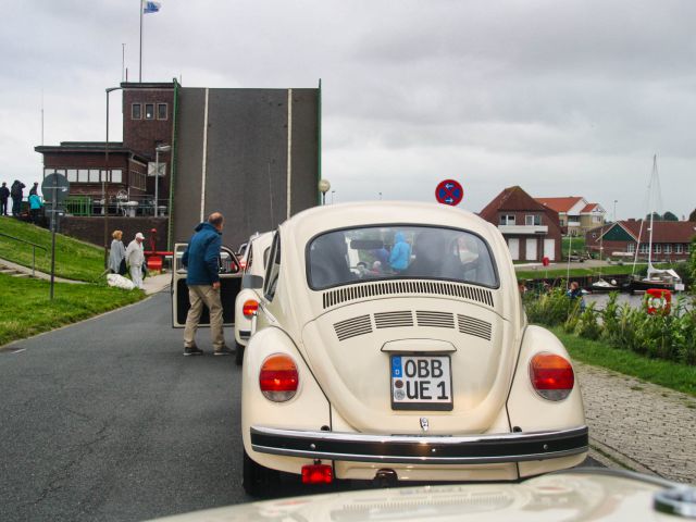 The rest of the journey took us through rural areas with a lot of agriculture and livestock farming towards Carolinensiel and on to Harlesiel, partly along the Harle. A special permit allowed the K-UE Club to set up the Beetles in Harlesiel harbour for a photo session. The arrival of the Beetles had been publicised by the local tourist office and a large number of people had come to watch the event with enthusiasm.