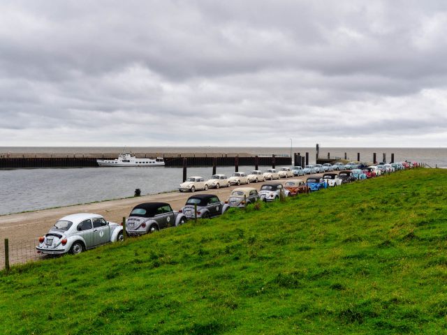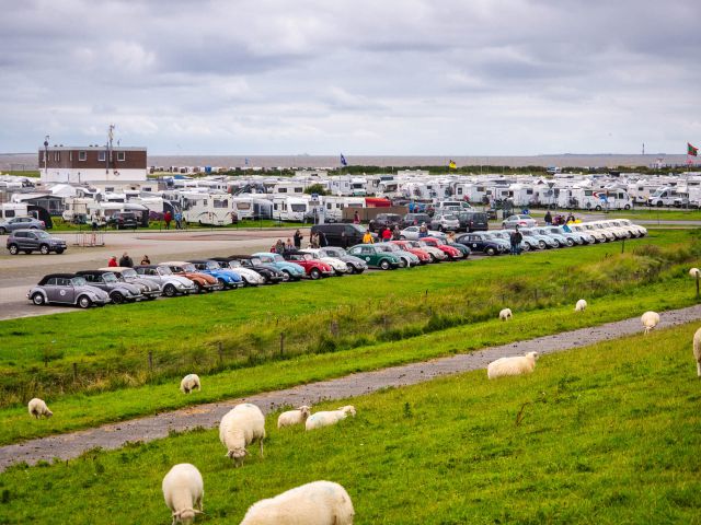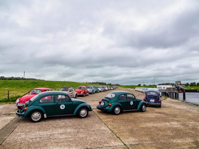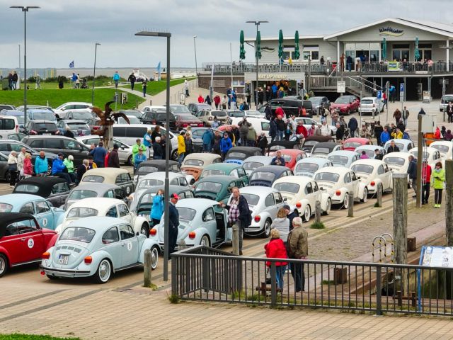 We continued our journey to Sielhof Neuharlingersiel, where a unique atmosphere awaited us. All the car parks there were blocked off for the Beetles. We were served tea and a freshly baked Frisian waffle with cherries and cream. All the Beetles remained parked at the Sielhof, while the group of Beetles set off on foot to the ferry quay for the departure of the ferry to the island of Spiekeroog.