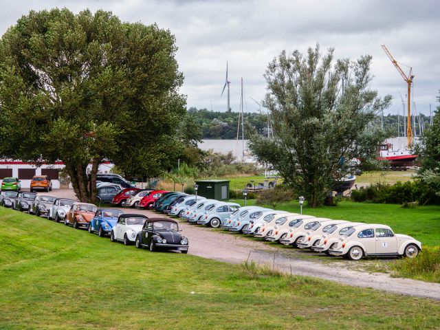 El resto del viaje nos llevó por zonas rurales con mucha agricultura y ganadería hacia Carolinensiel y de ahí a Harlesiel, en parte a lo largo del Harle. Un permiso especial permitió al Club K-UE instalar los escarabajos en el puerto de Harlesiel para una sesión fotográfica. La llegada de los escarabajos había sido anunciada por la oficina de turismo local y un gran número de personas había acudido a presenciar el acontecimiento con entusiasmo.